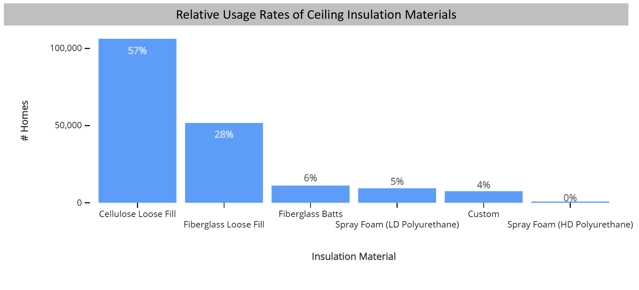 A little over 80% of homes use loose-fill ceiling insulation. About the same number of homes use fiberglass batts as spray foam insulation for attic insulation. The average home has an R-14 cavity and R-22 continuous insulation for a U-Factor of 0.04. Realistically, though, R-13 cellulose loose-fill cavity insulation is the most used attic insulation application.