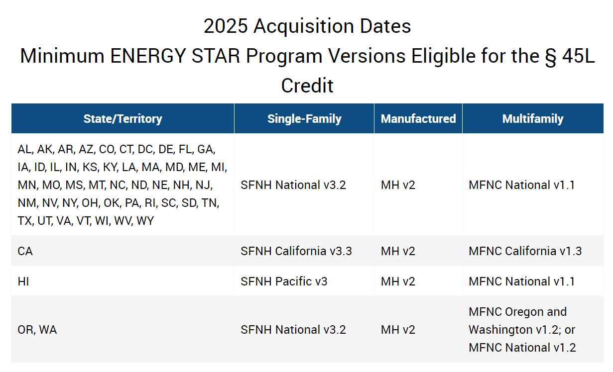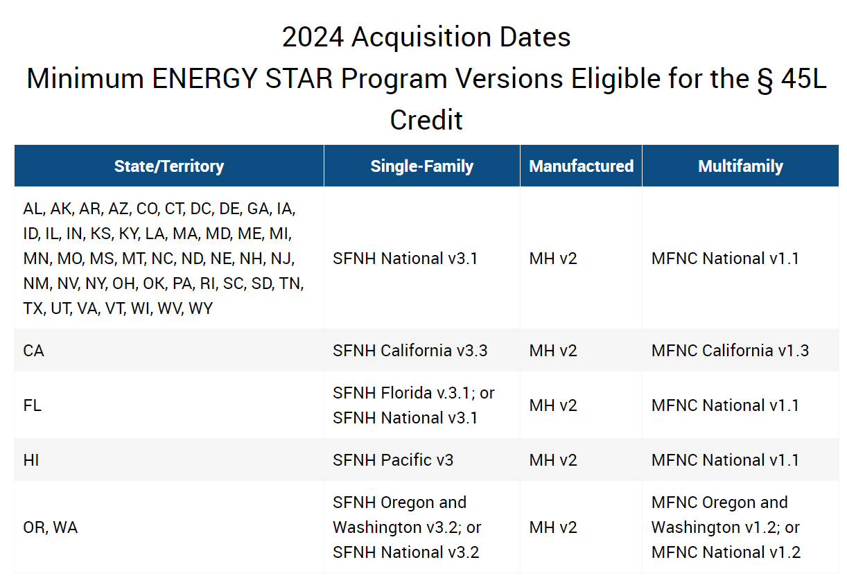 Minimum Applicable ENERGY STAR Program Versions Eligible for the 45L Tax Credit by Acquisition Date: