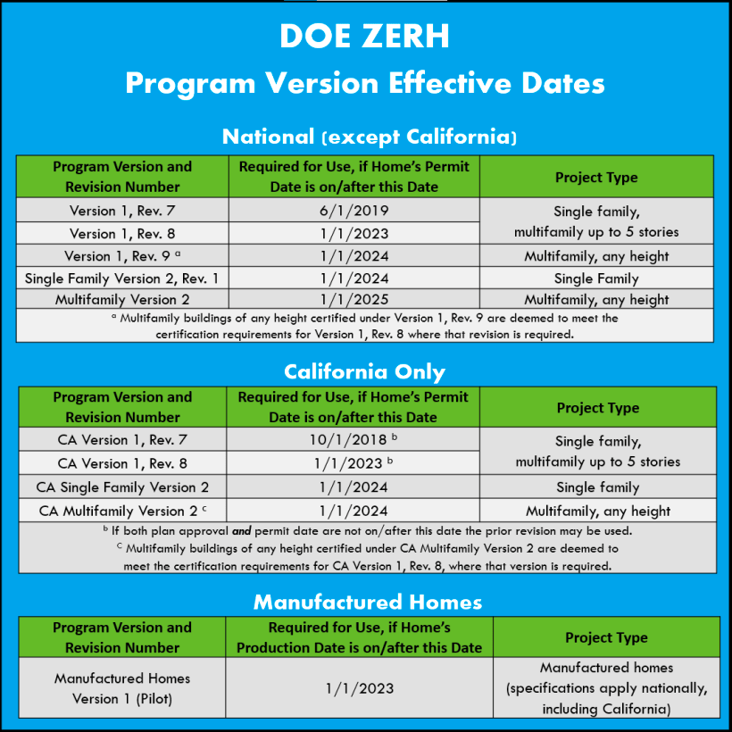 DOE ZERH Minimum Applicable Version Effective Dates: