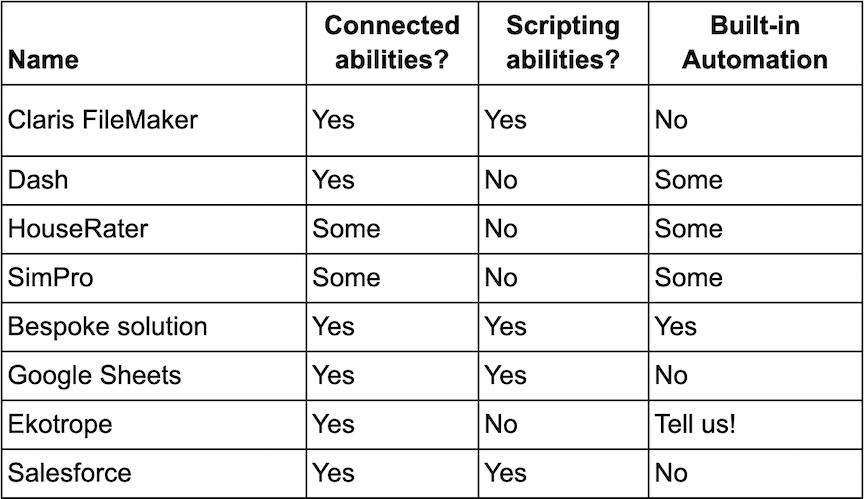 In general, a business and project management tool helps you process leads, keep track of projects/jobs, billing, schedule jobs, HR, and HERS Rating Specific tasks like track QA, equipment calibrations, etc. In order to have the flexibility to automate these processes like select and track QA (let us know if you are interested in doing this in Ekotrope!), dispatch inspections, and other business functions it is critical that these tools have either a scripting environment or built to our industries’ specific needs. Depending on rating companies’ budget and needs we’ve seen the following tools used: Ekotrope (yes!), Salesforce, Google Sheets, Dash, and bespoke solutions.